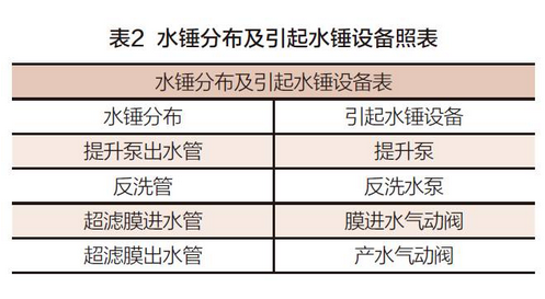 由于本超濾系統(tǒng)規(guī)模大,管道粗,水錘明顯。水錘位置主要存在于本系統(tǒng)的提升泵出水管、反洗管、超濾膜進(jìn)水管及超濾膜出水管中。對(duì)于這些管道及設(shè)備安裝位置可知,各位置引起水錘原因是有所不同,具體如表2所示: