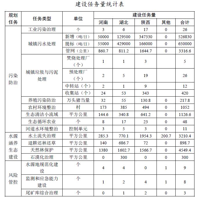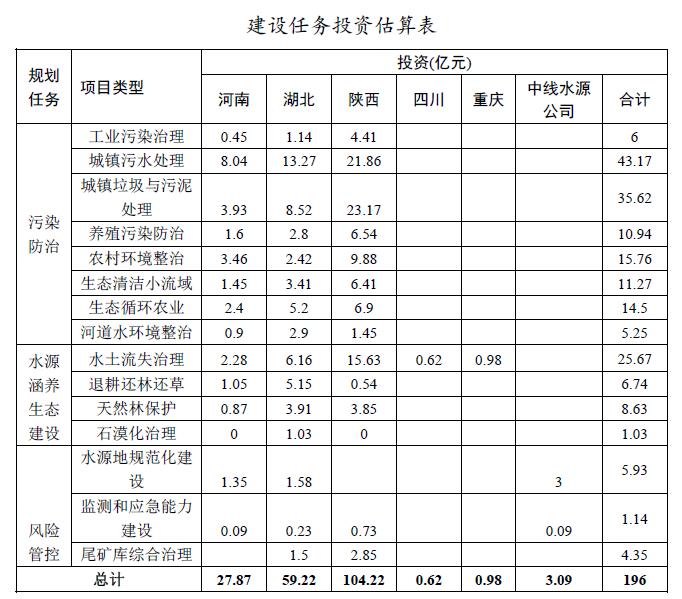 按任務類型分,水污染防治類投資142.51億元,水源涵養(yǎng)生態(tài)建設類投資42.07億元,風險管控類投資11.42億元。