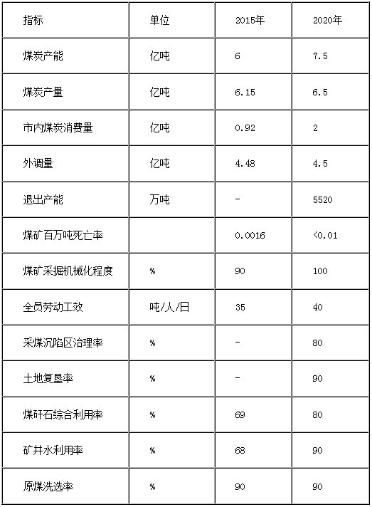 “十三五”期間,在滿足國(guó)內(nèi)煤炭市場(chǎng)需求,保障市內(nèi)煤電、煤化工原料煤炭供應(yīng)的前提下,到2020年,全市原煤產(chǎn)能控制在7.5億噸(預(yù)留1億噸市場(chǎng)調(diào)節(jié)產(chǎn)能);產(chǎn)量控制在6.5億噸左右。堅(jiān)持推進(jìn)煤炭綠色開(kāi)采,采區(qū)回采率達(dá)到85%以上。推廣充填開(kāi)采、保水開(kāi)采和薄煤層開(kāi)采等綠色開(kāi)采技術(shù)。