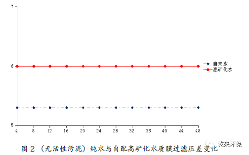 3.1 無活性污泥條件下自配高礦化水對膜污染影響:通過對兩種水質(zhì)跨膜壓差的測定,研究高礦化水質(zhì)對膜通量的影響以及膜兩側(cè)離子濃度的變化。試驗過程中采用同一膜,反應(yīng)器中不加入活性污泥,產(chǎn)水通量均設(shè)置為17 L/m2.h、試驗溫度相同均為14℃,全過程不進行曝氣和反沖,經(jīng)過48 小時的抽吸水,每隔4 小時分別測定膜過濾壓差。(1)跨膜壓差隨時間的變化研究。在相同試驗條件下,測得自來水和自配高礦化水兩種水質(zhì)48 小時內(nèi)膜過濾壓差都沒有變化,跨膜壓差分別為5.3 kpa、6.0 kpa,可見,自配高礦化水中無機鹽離子對膜污染有一定的貢獻。如圖2 所示。