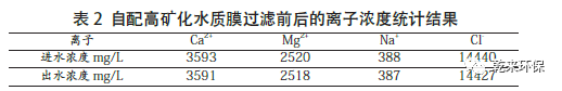 (2)膜過濾前后離子濃度變化研究。自配高礦化水通過膜過濾前后離子濃度變化情況見表2。