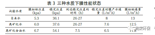 3.2 長慶油田高礦化含油廢水對膜污染影響研究:反應(yīng)器中加入活性污泥,并同時進行曝氣,分別以自來水、自配高礦化水、高礦化含油水(即高礦化/ 懸浮物水質(zhì))考察跨膜壓差及膜產(chǎn)水通量隨時間的變化。試驗過程中使用同一個膜,污泥濃度為6 g/L,曝氣量為0.35 m3/h,水溫為14℃。測定自來水、自配高礦化水和高礦化含油水初始跨膜壓差、穩(wěn)定跨膜壓差、膜初始通量、穩(wěn)定膜產(chǎn)水通量見表3。