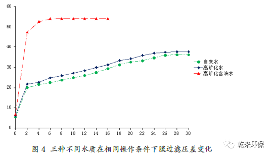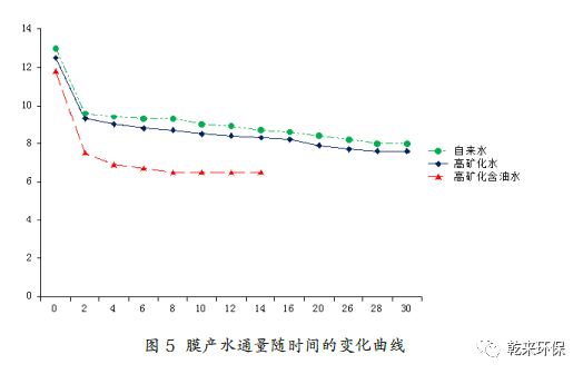 從表3 中可以看出,在蠕動泵同樣抽吸的情況下,自來水、自配高礦化水和高礦化含油水三種水質(zhì)條件下,膜穩(wěn)定壓差依次增大,到達(dá)穩(wěn)定壓差時膜的產(chǎn)水通量依次減小,表明無機鹽類離子、油類物質(zhì)、機雜等均造成膜的孔徑堵塞,對膜產(chǎn)生污染影響。