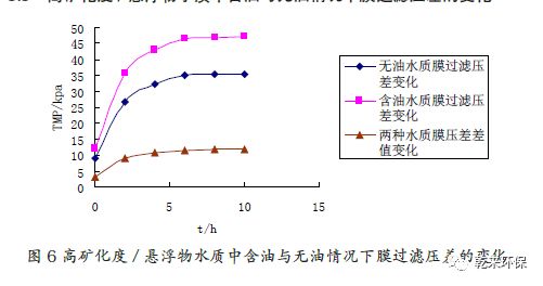 3.3 高礦化度/ 懸浮物水質(zhì)中含油與無油情況下膜過濾壓差的變化:圖6 表明,高礦化度/ 懸浮物水質(zhì)中含油時膜過濾壓差明顯大于無油的膜過濾壓差,并且壓差增長數(shù)值逐漸增大,最大達(dá)到穩(wěn)定。說明含油時水質(zhì)對膜污染影響較大。