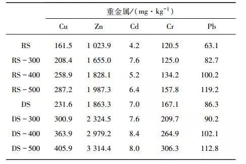 表2為生污泥和消化污泥中Cu、Zn、Cd、Cr、Pb五種重金屬元素總量。由表2可知,污泥中5中重金屬元素含量順序?yàn)椋篫n>Cu>Cr>Pb>Cd。一般而言我國(guó)污泥中含有較高濃度的Zn和Cu,而含有較低濃度的Cd。厭氧消化后污泥中各金屬含量相比原污泥有較大的增長(zhǎng),這也導(dǎo)致同等溫度下消化污泥熱解炭中五種重金屬含量均高于生污泥熱解炭,其中消化污泥熱解炭中重金屬Cr、Zn、Cu約為生污泥熱解炭的1.5倍。