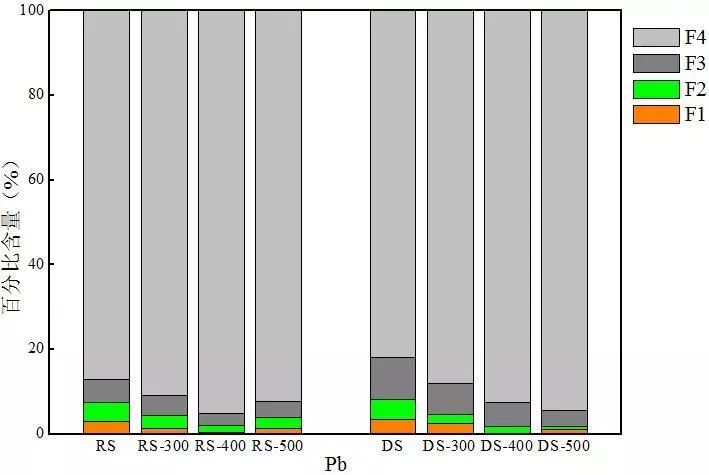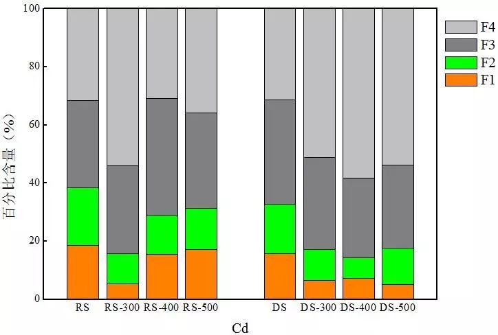 對(duì)比兩種熱解炭中Cr的分布可以發(fā)現(xiàn),消化污泥熱解炭中穩(wěn)定態(tài)Cr含量均高于同等溫度下生污泥熱解炭,尤其是F3態(tài)Cr的含量。以300 ℃熱解炭為例,RS-300和DS-300中F3態(tài)Cr的含量分別為35.4%和49.7%。這可能是因?yàn)樯勰嘀泻写罅康暮蚧衔?S含量達(dá)到1.97%),在厭氧環(huán)境下Cd更易形成硫化物,使消化污泥中F3態(tài)含量高于生污泥,從35.5%增加到53.5%,進(jìn)而導(dǎo)致消化污泥熱解炭中F3態(tài)Cr含量高于生污泥熱解炭。