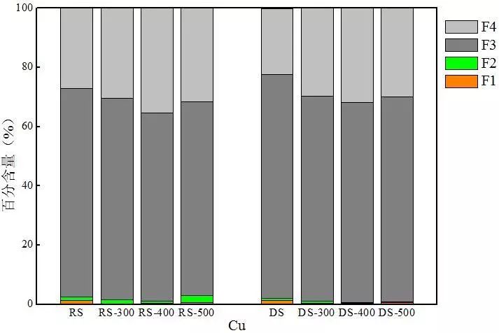 對(duì)比兩種熱解炭中Cu的分布可以發(fā)現(xiàn),消化污泥熱解炭中穩(wěn)定態(tài)Cu含量也均高于同等溫度下生污泥熱解炭,尤其是F3態(tài)的含量,這是因?yàn)榻?jīng)過(guò)厭氧消化后F3態(tài)的比例增加,從70.5%增加到75.7%,進(jìn)而使消化污泥熱解炭中F3態(tài)含量高于生污泥熱解炭。消化污泥F3態(tài)Cu含量增加可能是由于大量的含硫化合物在硫酸鹽還原菌的作用下生成S2-,導(dǎo)致消化后的硫化物形態(tài)增加。即增大了F3態(tài)Cu的含量。