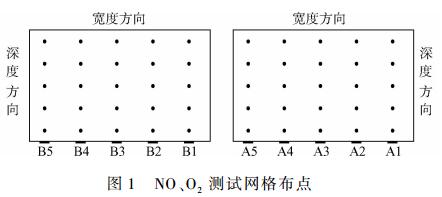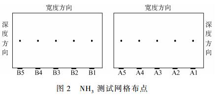 通過網(wǎng)格布點(diǎn)測(cè)量SCR裝置的入口及出口煙道,煙道共布置10個(gè)測(cè)孔,編號(hào)依次為B5→B1、A5→A1,其中NO、O2取樣點(diǎn)共選取2×5×5個(gè)(取深度方向5點(diǎn)均值),NH3取樣點(diǎn)共選取2×5×1個(gè),具體布置如圖1所示。NO、O2經(jīng)Testo350煙氣分析儀直接測(cè)定,氨逃逸樣品采用美國EPA的CTM-027標(biāo)準(zhǔn)以化學(xué)溶液法采集,取樣時(shí)間20min。通過分析樣品溶液中的氨濃度(見圖2),并根據(jù)所采集的干態(tài)煙氣流量和O2,計(jì)算各點(diǎn)干基煙氣NH3濃度。