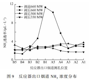 調(diào)后機(jī)組330MW負(fù)荷下,氨逃逸B側(cè)波動(dòng)范圍為2.07~2.81μL?L-1,A側(cè)波動(dòng)范圍為1.68~2.49μL?L-1,系統(tǒng)平均為2.14μL?L-1。較調(diào)前660MW負(fù)荷分別下降了1.97、1.61、2.50μL?L-1,降幅分別為42.4%、34.8%、53.8%。這表明:噴氨格柵調(diào)整后,由于局部區(qū)域(B1、A5、A4)噴氨量大幅降低,氨逃逸畸高點(diǎn)消除,系統(tǒng)噴氨更加均勻,從而帶動(dòng)整個(gè)系統(tǒng)氨逃逸率的大幅下降。