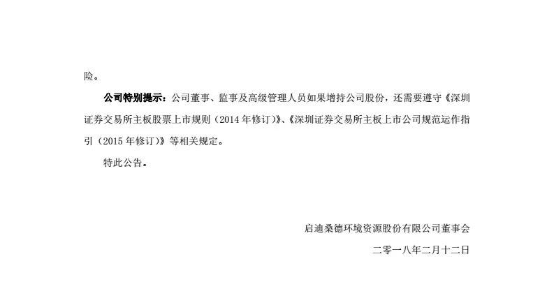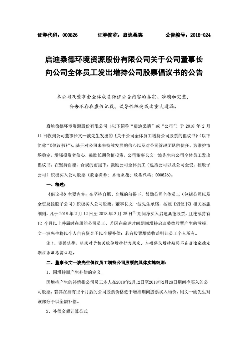 今2月11日,啟迪桑德發(fā)布一則重磅公告,基于對公司未來持續(xù)發(fā)展的信心以及對公司管理團(tuán)隊(duì)的信任,為維護(hù)市場穩(wěn)定,增強(qiáng)投資者信心,鼓勵(lì)長期價(jià)值投資,文一波董事長以個(gè)人名義向公司全體員工發(fā)出倡議書。