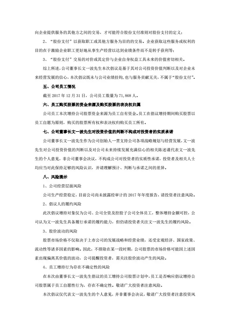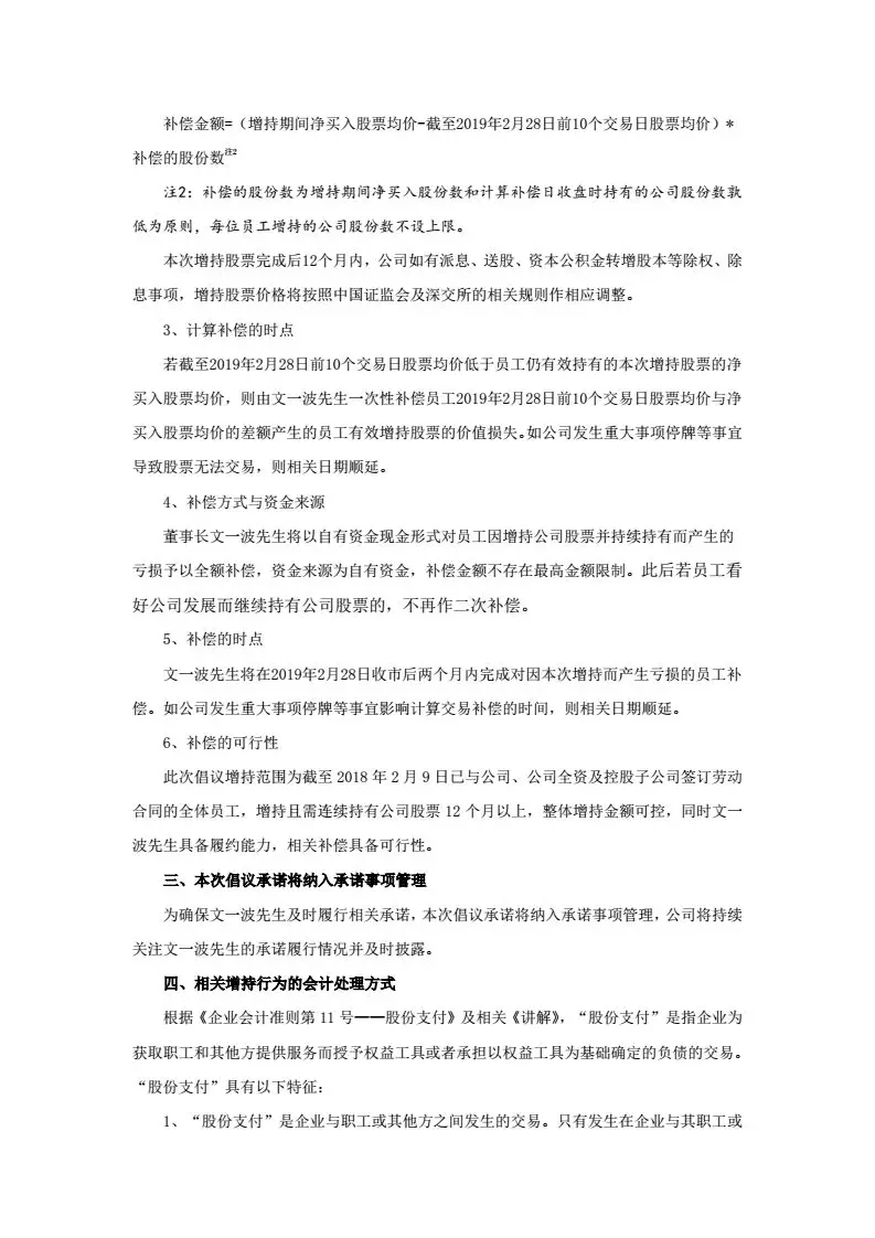 二、補(bǔ)償不設(shè)上限?!岸麻L文一波先生將以自有資金現(xiàn)金形式對員工因增持公司股票并持續(xù)持有而產(chǎn)生的虧損予以全額補(bǔ)償,資金來源為自有資金,補(bǔ)償金額不存在最高金額限制。”換句話說就是,虧多少,補(bǔ)多少,你虧,董事長補(bǔ)!