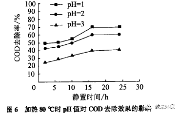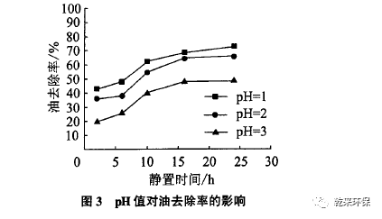 從圖3和圖4可以看出,加酸破乳比加熱破乳效果更明顯,油的去除率最高可以達(dá)到73%,COD的去除率可以達(dá)到64%。試驗(yàn)過(guò)程中加入硫酸調(diào)整pH值,加入酸后震蕩1 min,水面明顯出現(xiàn)一層油,但是比單純加熱產(chǎn)生的浮油顏色淺,呈黃色,這說(shuō)明加酸后破壞了乳化液,形成了有機(jī)酸而使油水分離。而且pH值越低,產(chǎn)生的浮油量越多,浮油出現(xiàn)的速度也越快。隨著靜置時(shí)間的增加,pH值越低錐形瓶?jī)?nèi)乳化液分層越明顯。靜置10 h以上,pH值為1、2的錐形瓶底部出現(xiàn)一層透明的清液,中間大部分是混濁的乳白色,上部一層黃色浮油,pH=3的錐形瓶底部沒有明顯的透明清液。建議酸化破乳pH值控制在1—2。