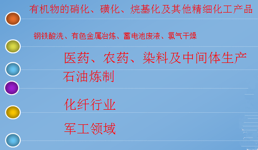 有機化工產(chǎn)品如檸檬酸、氨基磺酸、草酸、硫酸二甲酸、合成甲酚、十二烷基苯磺酸等產(chǎn)品及磺化、硝化、烷基化、酯化等化學(xué)反應(yīng)單元,這些反應(yīng)廣泛用于農(nóng)藥、醫(yī)藥、染料、香料等行業(yè)生產(chǎn),都大量用到硫酸。每年應(yīng)用于有機化工產(chǎn)品的硫酸在1000-1500萬噸,其中有參與化學(xué)反應(yīng),同時產(chǎn)生大量20-60%的廢硫酸,保守統(tǒng)計,應(yīng)該在2000萬噸以上部分。