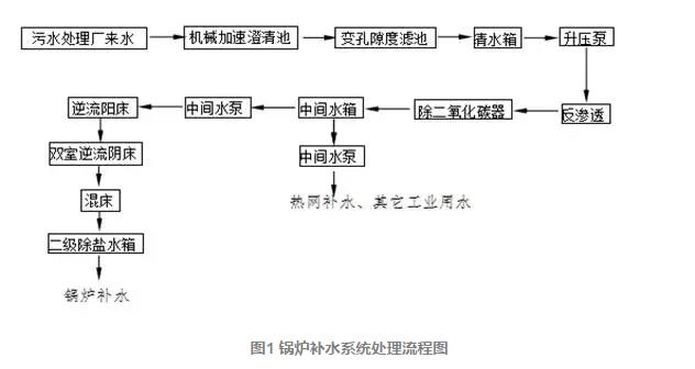 侯馬市水資源短缺,根據(jù)國(guó)家“禁用地下水、慎用地表水、鼓勵(lì)用中水”的環(huán)保政策,我公司在設(shè)計(jì)中本著盡量減少新鮮水用量的原則,在工業(yè)用水設(shè)計(jì)中采用了一水多用、按質(zhì)使用、逐步降級(jí)使用的方案,利用城市污水處理廠的城市中水,經(jīng)過(guò)一系列深度處理后,作為本機(jī)組發(fā)電運(yùn)行的鍋爐補(bǔ)給水、熱網(wǎng)補(bǔ)水、輔機(jī)冷卻水及其它工業(yè)用水水源,將澮河二庫(kù)地表水作為電廠生產(chǎn)用水應(yīng)急備用水源。廠內(nèi)配套建設(shè)了給排水、中水深度處理回用系統(tǒng)。根據(jù)城市污水廠出水水質(zhì),鍋爐補(bǔ)水處理系統(tǒng)采用以下方案,前段出水可用于熱網(wǎng)補(bǔ)水及其它工業(yè)用水,流程見(jiàn)下圖。