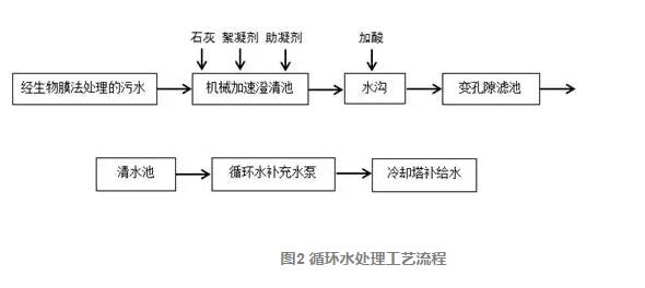 城市中水進(jìn)入機(jī)械加速澄清池,在池中,中水與加入的石灰、絮凝劑充分混合:石灰可降低污水中的暫時(shí)硬度和堿度,同時(shí)可為凝聚、吸附提供CaCO3晶核,在絮凝劑作用下,可提高混凝澄清效果;加入助凝劑可促使礬花長(zhǎng)大,進(jìn)一步提高出水品質(zhì);在水溝中加入酸液中和過(guò)飽的CaCO3,防止產(chǎn)生碳酸鈣堵塞濾料;經(jīng)石灰、混凝處理后的中水中殘存粘接性雜質(zhì),用普通濾池容易產(chǎn)生濾層表面阻力大、周期短,且不易清洗干凈,為此,采用了變孔隙深層濾池,過(guò)濾后的水進(jìn)入清水池,再經(jīng)循環(huán)水補(bǔ)充水泵打入輔機(jī)循環(huán)冷卻水系統(tǒng)。機(jī)組單機(jī)運(yùn)行輔機(jī)冷卻水所用中水量730t/日、21900t/月。
