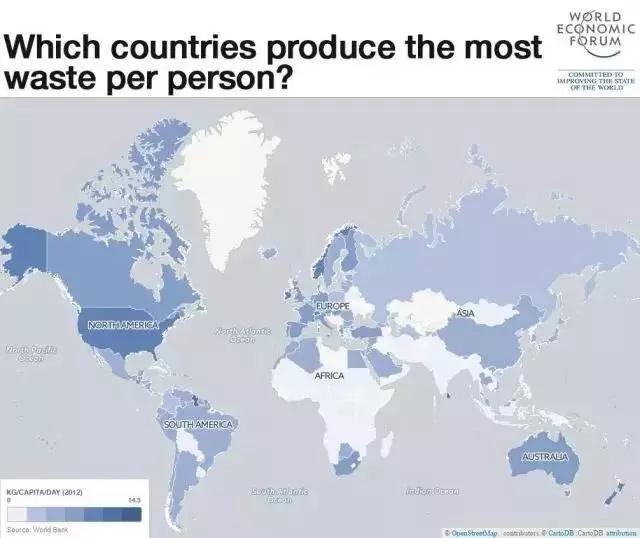 來自世界經(jīng)濟(jì)論壇的一張全球人均生產(chǎn)垃圾分布地圖顯示,人均垃圾生產(chǎn)量(單位:公斤/天)排名前五位的均為發(fā)達(dá)國家:新西蘭(3.68),愛爾蘭(3.58),挪威(2.8),瑞士(2.61),美國(2.58),而中國人均垃圾生產(chǎn)量基本維持在世界平均水平——1.2。