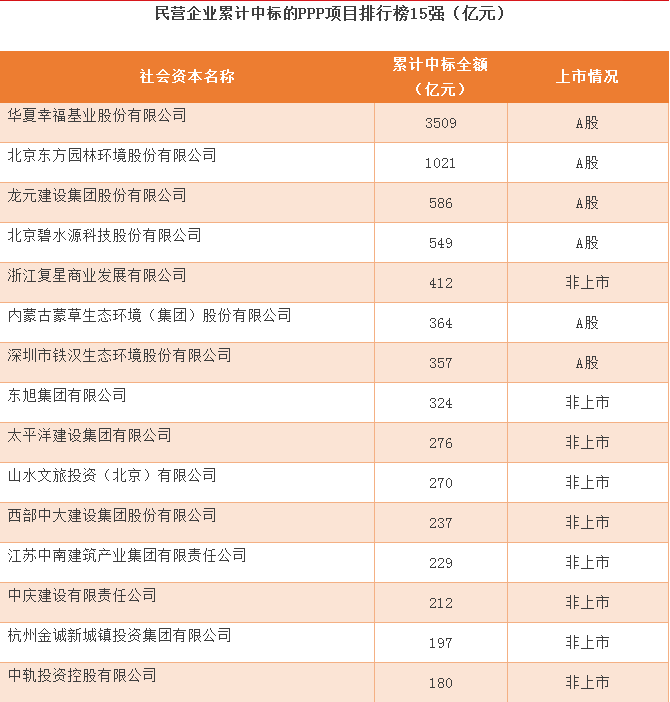 上榜民營企業(yè)PPP前15強的企業(yè),累計中標的PPP項目金額最低門檻是180億元。