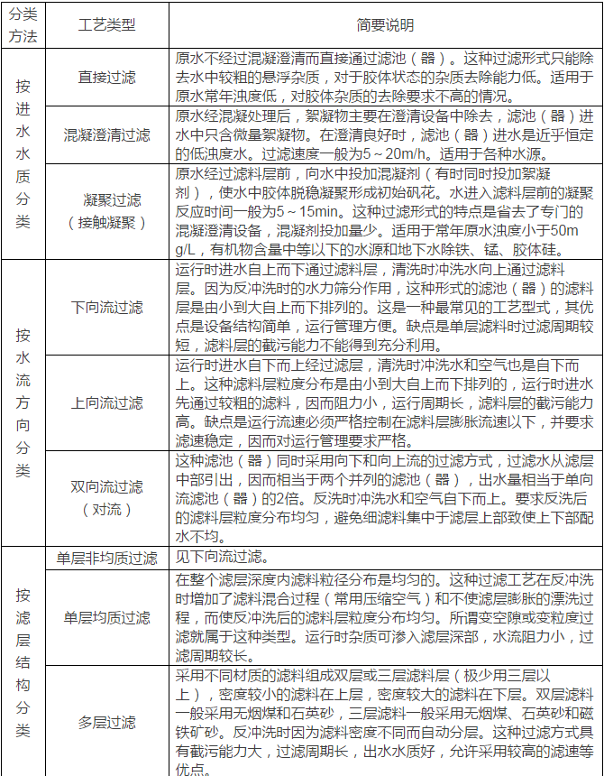 當(dāng)原水濁度低于150mg/L時,也可以采用原水直接過濾或接觸混凝過濾。有的地下水,雖然濁度較低(一般在5mg/L以下),但為了除去鐵和錳等金屬化合物,常用接觸混凝或者錳砂過濾。(常見的過濾工藝的分類見下表1-2)。