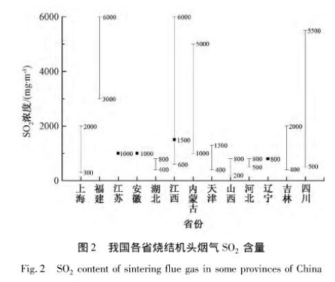 燒結(jié)機頭煙氣中SO2因燒結(jié)原料的配比、鋪料方式、燒結(jié)工況等因素影響,波動很大,不同地區(qū)原料不同,差異明顯。我國各地區(qū)燒結(jié)機頭煙氣中SO2含量見圖2。