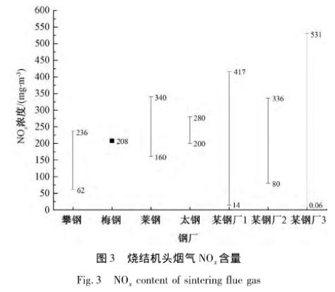 由燒結(jié)燃料(煤粉、焦粉)燃燒產(chǎn)生的燃料型NO,占燒結(jié)煙氣中NOx的90%以上。見圖3,我國燒結(jié)煙氣中NOx含量為100~500mg/m3,波動較大。目前,燒結(jié)煙氣脫硝主要以活性炭/焦吸附為主。
