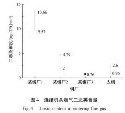 燒結(jié)過程中的二惡英主要由“從頭合成”途徑生成。燒結(jié)原料中含有的Fe、Cu、Cl等元素提供了催化劑和氯源;燃料的不充分燃燒提供了大分子碳源;燒結(jié)過程漏風率高,含氧充足,在250~450℃,二惡英的“從頭合成”得以發(fā)生。目前國內(nèi)關(guān)于燒結(jié)煙氣中二惡英含量的報道較少,如圖4所示,不同燒結(jié)煙氣的二惡英排放量差別很大,可能跟原料與工況有關(guān)。