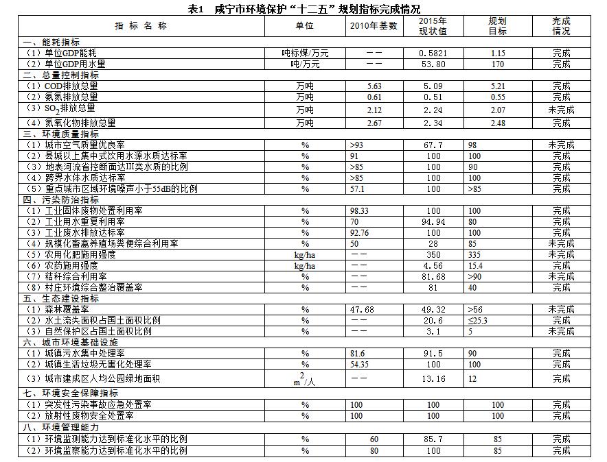 表1 咸寧市環(huán)境保護“十二五”規(guī)劃指標完成情況