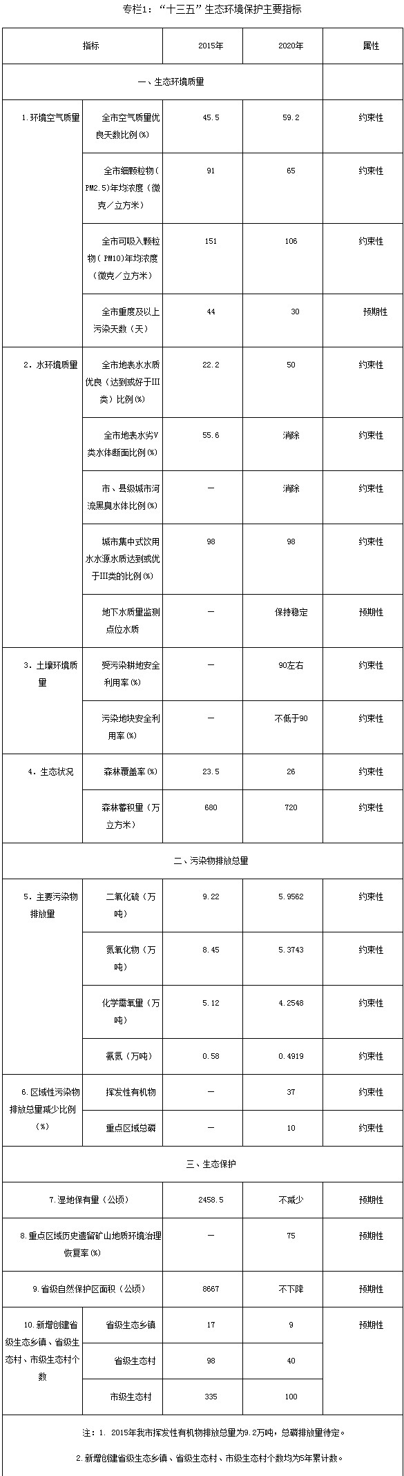 1.我市生態(tài)環(huán)境質(zhì)量總體水平有待進(jìn)一步提高。2015年,我市空氣質(zhì)量?jī)?yōu)良天數(shù)比例、可吸入顆粒物年均濃度、細(xì)顆粒物年均濃度、重度污染天數(shù)等指標(biāo)雖較“十一五”有較大程度改善,但仍然不容樂觀。全市地表水水質(zhì)優(yōu)良比例和劣V類水體斷面的比例指標(biāo)仍有較大的改善空間。