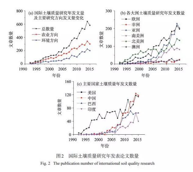 相對于發(fā)達(dá)國家,發(fā)展中國家人口眾多,人均資源匱乏,農(nóng)業(yè)管理也呈現(xiàn)農(nóng)戶個體經(jīng)營零碎化,管理方式不一致。而發(fā)達(dá)國家機械化大規(guī)模操作,使得農(nóng)業(yè)的管理趨于一致。從近幾年土壤質(zhì)量的研究趨勢來看,發(fā)展中國家尤其是中國在其中所占的比例日益增大。隨著全球一體化的快速推進,發(fā)展中國家對糧食安全和環(huán)境保護的訴求也愈加強烈。第十八屆國際土壤學(xué)大會指出,將來有兩個主要趨勢:在食物匱乏的國家,只要這種匱乏還存在,土壤科學(xué)主要就將致力于解決土壤肥力問題。不幸的是,這種威脅在非洲、亞洲和中南美洲都不斷增長。土壤質(zhì)量作為環(huán)境質(zhì)量、糧食安全與經(jīng)濟問題的紐帶,迎合了發(fā)展中國家的需求。