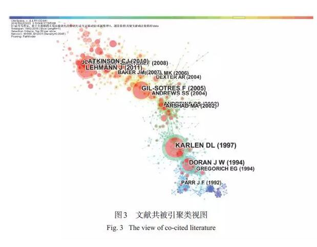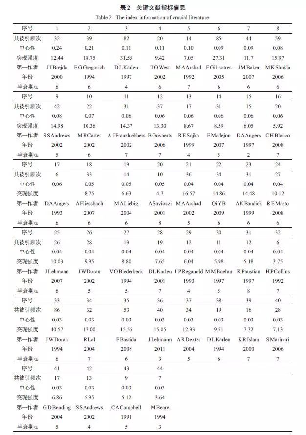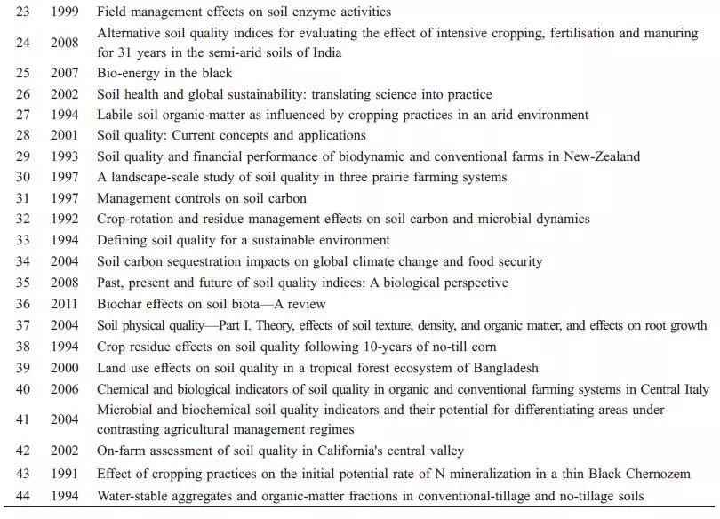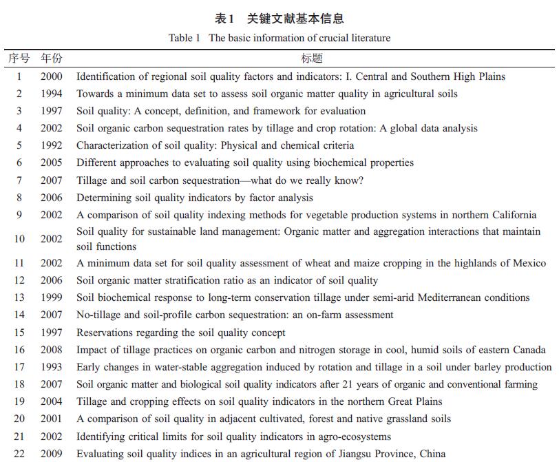 經(jīng)典文獻(xiàn)都密切關(guān)注了文獻(xiàn)發(fā)表時期該領(lǐng)域發(fā)展的熱點問題,因其較高的社會關(guān)注度、創(chuàng)新性和系統(tǒng)性,從而引發(fā)其他學(xué)者大量引用。通過對44 篇經(jīng)典文獻(xiàn)內(nèi)容的分析,2000 年以前多關(guān)注農(nóng)業(yè)管理措施對有機質(zhì)的影響和土壤質(zhì)量的概念,2000 年以后,對土壤質(zhì)量評價方法、評價指標(biāo)尤其是生物學(xué)指標(biāo)的研究不斷興起,更多地注重土壤質(zhì)量在農(nóng)業(yè)和環(huán)境方面的應(yīng)用,2008 年以來,關(guān)于土壤質(zhì)量與全球氣候變化、土壤修復(fù)的關(guān)系研究受到更多學(xué)者關(guān)注。從整個過程來看,土壤質(zhì)量從概念的產(chǎn)生到廣泛的應(yīng)用,一直圍繞農(nóng)業(yè)與環(huán)境的可持續(xù)發(fā)展,這也是人類可持續(xù)發(fā)展的主題之一。