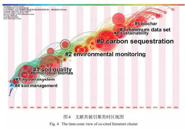 本研究中所認(rèn)為的“研究主題”是指在一定時段內(nèi),眾多學(xué)者探討和解決的中心問題,Citespace V通過對文獻(xiàn)共被引的分析,將研究內(nèi)容相似的文獻(xiàn)進行歸類并命名。通過對5 551 篇文獻(xiàn)進行共被引分析,共獲取28 個聚類,如果聚類中文獻(xiàn)數(shù)量較少,則會影響其命名的準(zhǔn)確性,因此本研究選取文獻(xiàn)數(shù)量在30 篇以上的8 個聚類進一步分析,聚類的時間分布和命名見圖 4。通過圖4 可以發(fā)現(xiàn),研究早期(2000 年以前) 主題較為分散,主要集中在土壤管理(#4)、農(nóng)業(yè)生態(tài)系統(tǒng)(#7)、微生物生物量(#6)、土壤質(zhì)量概念(#1) 等方面,2000 年以來,環(huán)境監(jiān)測(#2)、碳匯(#0) 研究最多,另外近幾年焦點聚集在可持續(xù)性(#8)、最小數(shù)據(jù)集(#3)、生物炭(#5) 上。