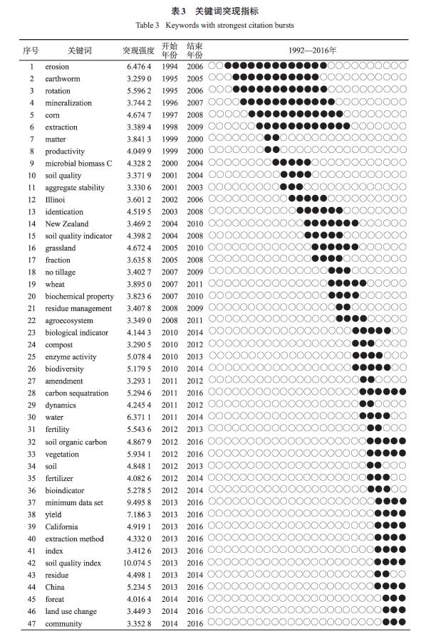 土壤質(zhì)量概念的產(chǎn)生與發(fā)展有著深刻的時代背景和需求。人類發(fā)展的階段性和動態(tài)性、全球氣候變化與人類活動影響的加劇、學(xué)科的不斷交融是決定土壤質(zhì)量主題演變的主要因素。土壤質(zhì)量在20 多年的發(fā)展階段中,涌現(xiàn)了一些標(biāo)志性的經(jīng)典文獻(xiàn),引發(fā)了大量學(xué)者關(guān)注,從而產(chǎn)生了新的研究點。依據(jù)Citespace V理論和分析結(jié)果,本文著重對文獻(xiàn)中心性高于0.03、突現(xiàn)性高于4、共被引頻次大于30 的關(guān)鍵文獻(xiàn)進行分析,綜合以上量化指標(biāo),對該領(lǐng)域研究熱點及其變遷進行了解析。在研究趨勢方面,截取突現(xiàn)性大于4,開始年份為2011年,結(jié)束年份為2016年的關(guān)鍵詞進行了分析。