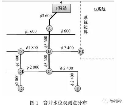 試驗開始前,對F調(diào)蓄池實施徹底清淤。每次試驗時,一般每隔24 h開啟調(diào)蓄池,調(diào)蓄池蓄滿時間均在15 min左右。設(shè)計試驗時,在F泵站進水總管、F系統(tǒng)邊界處,設(shè)置8個窨井水位觀測點,分別為:位于總管上的A、B、C 3個點;和B點直接相通的D2點、和B點直接相通且位于系統(tǒng)邊界處的E1點;相對位于遠端的、類似于進水管“肩膀”處的D、E、D1等3個點,詳見圖1。