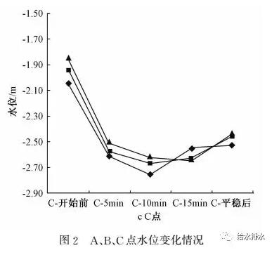 試驗發(fā)現(xiàn),A、B、C、D2、E1等5個點的水位,會隨F調(diào)蓄池進水至蓄滿而呈U型狀變化,以A、B、C為例(見圖2),基本都在10~15 min時水位變化最為明顯。但位于遠端的D、E、D1等3個點幾乎未發(fā)生變化。由此可以初步判斷,F(xiàn)調(diào)蓄池對進水總管的拉動,至C點結(jié)束,總長約1 200 m;調(diào)蓄池的運行,僅對鄰近的管網(wǎng)起到了收水效果。