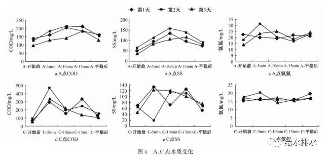 更值得注意的是A、B、C、D2、E1這5個點的水質(zhì)變化,以A、C兩點為例(見圖4),在15 min的進水過程中,隨著水位突降,COD和SS呈現(xiàn)出一個突增趨勢,氨氮卻相對平穩(wěn)。同時,調(diào)蓄池內(nèi)的水質(zhì)也大致如此,COD和SS在最后一天時達到最大值,而氨氮卻總體穩(wěn)定。