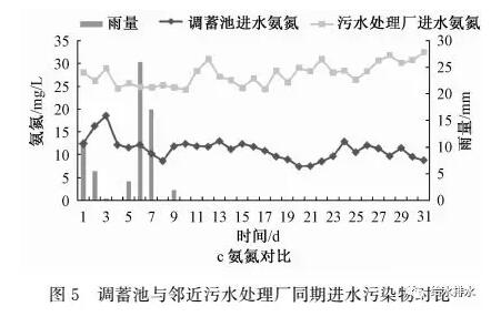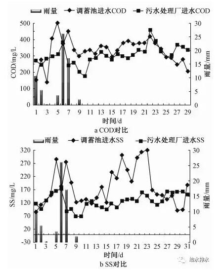汛后試驗的水質(zhì)監(jiān)測對象是調(diào)蓄池進水,將其與同期污水處理廠進水水質(zhì)比較,結(jié)果見圖5。