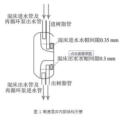 凝結(jié)水高速混床樹脂在上下隔板之間,通過隔板間的不銹鋼水帽隔離,進(jìn)水通過水帽進(jìn)入樹脂,通過樹脂層進(jìn)行處理后,再通過下水帽出水(圖 1)。上水帽的間隙為0.35 mm,下水帽的間隙為0.3 mm,樹脂捕捉器濾元縫隙寬度0.20 mm。樹脂粒度范圍:陽樹脂0.63~0.81 mm,陰樹脂0.45~0.71 mm。根據(jù)對混床水帽和樹脂捕捉器的檢查情況,判斷樹脂不是在運(yùn)行階段進(jìn)入系統(tǒng),只有在此次機(jī)組啟動和上次機(jī)組停運(yùn)階段漏入系統(tǒng)。樹脂從高速混床漏出只有兩個途徑:從上水帽漏出;從下水帽漏出。