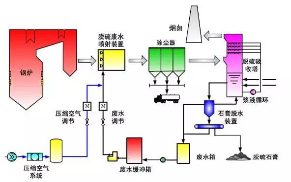 將末端廢水霧化后噴入除塵器入口前煙道內(nèi),利用煙氣余熱將霧化后的廢水蒸發(fā);也可以引出部分煙氣到噴霧干燥器中,利用煙氣的熱量對(duì)末端廢水進(jìn)行蒸發(fā)。在煙道霧化蒸發(fā)處理工藝中,霧化后的廢水蒸發(fā)后以水蒸氣的形式進(jìn)入進(jìn)入脫硫吸收塔內(nèi),冷凝后形成純凈的蒸餾水,進(jìn)入脫硫系統(tǒng)循環(huán)利用。同時(shí),末端廢水中的溶解性鹽在廢水蒸發(fā)過程中結(jié)晶析出,并隨煙氣中的灰一起在除塵器中被捕集。