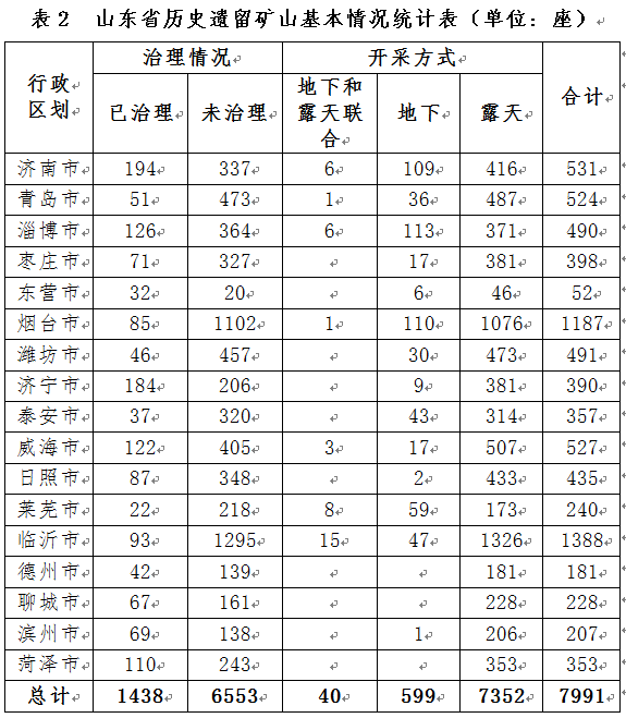 全省共有歷史遺留非煤礦山廢棄礦井1302處,主要涉及金、鐵、石膏、耐火粘土等礦種,主要分布于濟(jì)南、煙臺、威海、臨沂等地。