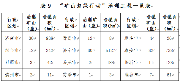 2013年全省編制實施了《山東省礦山復(fù)綠行動實施方案》,共確定治理礦山400座,目前已治理完成254座,146座未完成。部署到2020年治理礦山146座,治理面積0.75萬公頃(含采煤塌陷地0.44萬公頃,“三區(qū)兩線”可視范圍內(nèi)歷史遺留礦山0.15萬公頃),主要分布于濟(jì)南、煙臺、濟(jì)寧、泰安等地(表9)。
