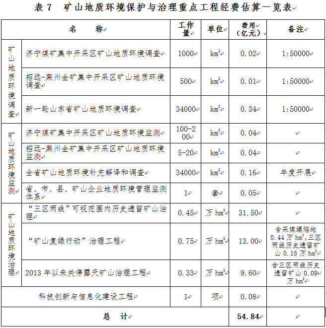 在濟(jì)寧煤礦集中開采區(qū)、招遠(yuǎn)-萊州金礦集中開采區(qū)開展礦山地質(zhì)環(huán)境專項調(diào)查,在全省開展新一輪礦山地質(zhì)環(huán)境詳細(xì)調(diào)查。調(diào)查費(fèi)用估算為0.37億元。