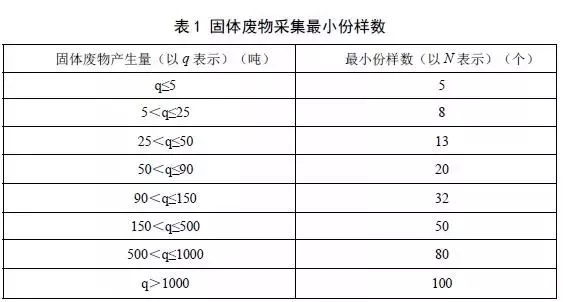 b)間歇產(chǎn)生固體廢物時,如固體廢物產(chǎn)生的時間間隔小于一個月,應(yīng)以確定的工藝環(huán)節(jié)一個月內(nèi)的固體廢物最大產(chǎn)生量為依據(jù),按照表1確定需要采集的最小份樣數(shù)。如固體廢物產(chǎn)生的時間間隔大于一個月,以每次產(chǎn)生的固體廢物總量為依據(jù),按照表1確定需要采集的份樣數(shù)。