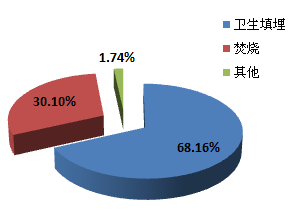 目前,我國(guó)城市生活垃圾無(wú)害化處理方式包括:衛(wèi)生填埋、高溫堆肥和焚燒,圖1為2014年我國(guó)垃圾處理方式比例,顯示我國(guó)仍然以填埋為主[2]。但焚燒憑借其減量效果最明顯、無(wú)害化最徹底、且焚燒熱量可以有效利用的特點(diǎn),近年來(lái)比例上升很快,可以預(yù)見(jiàn),焚燒正逐步成為處理城市垃圾的最主要方式。