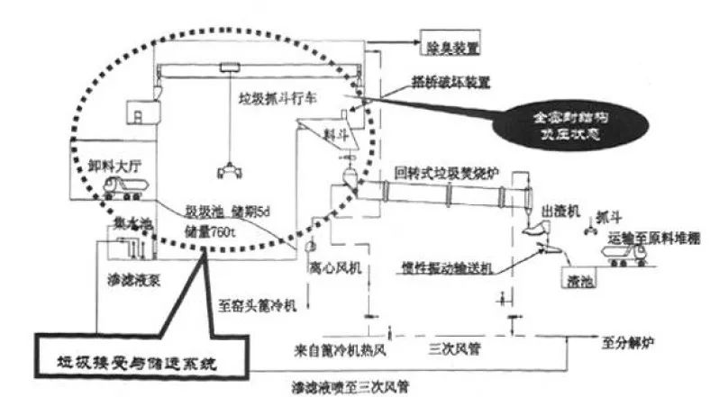垃圾由垃圾專用車運(yùn)輸進(jìn)廠后先經(jīng)地衡進(jìn)行稱重,再運(yùn)輸至卸料平臺(tái),經(jīng)卸料門卸至垃圾貯坑儲(chǔ)存,并由抓斗將垃圾按進(jìn)廠時(shí)間在池內(nèi)分開(kāi)堆放,再由垃圾吊車和抓斗將垃圾運(yùn)送到垃圾料斗,經(jīng)垃圾推料器,把垃圾均勻喂入回轉(zhuǎn)式垃圾焚燒爐;從窯頭抽取的887℃熱風(fēng)作為焚燒爐燃燒氣體,垃圾燃燒后的熱煙氣進(jìn)窯尾系統(tǒng),垃圾在焚燒爐內(nèi)的焚燒溫度控制在1200℃左右,在此溫度段垃圾焚燒氣停留2秒,在850℃以上溫度停留5秒以上;氣體進(jìn)入預(yù)熱分解系統(tǒng)后,與生料進(jìn)行熱交換,同時(shí)分解部分有害物質(zhì),做到垃圾處理的資源化、無(wú)害化、減量化。流程圖見(jiàn)圖5所示。