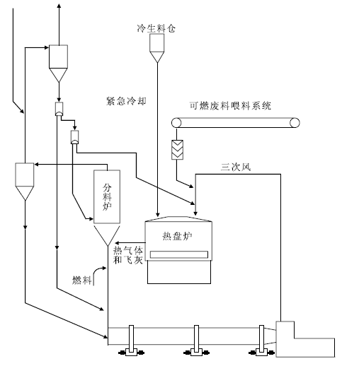 熱盤(pán)爐的工藝流程和結(jié)構(gòu)如圖6所示,其底部設(shè)有可調(diào)節(jié)轉(zhuǎn)速的圓形爐盤(pán)(1~4 r/h),可燃廢棄物(垃圾)通過(guò)計(jì)量后進(jìn)入爐內(nèi)。窯三次風(fēng)、部分高溫生料和可燃垃圾一同進(jìn)入熱盤(pán)爐內(nèi),在慢速旋轉(zhuǎn)的圓盤(pán)上開(kāi)始充分地氧化燃燒,從物料進(jìn)口到爐渣和生料混合物卸出,在圓盤(pán)上大約要運(yùn)轉(zhuǎn)270°。卸出的殘?jiān)蛳侣淙敫G尾,細(xì)小的飛灰和生料則隨1050 ℃左右的高溫氣體進(jìn)入分解爐。按可燃垃圾的性質(zhì),調(diào)節(jié)圓盤(pán)的轉(zhuǎn)速,使其能在爐內(nèi)有足夠的時(shí)間,達(dá)到充分燃燒的目的。當(dāng)燒成系統(tǒng)出現(xiàn)意外故障時(shí), 設(shè)在熱盤(pán)爐上方的冷生料倉(cāng)可以直接放入生料進(jìn)爐,阻斷垃圾燃燒,使熱盤(pán)爐上的火很快熄滅,避免水泥窯系統(tǒng)不正常時(shí)環(huán)保超標(biāo)排放。
