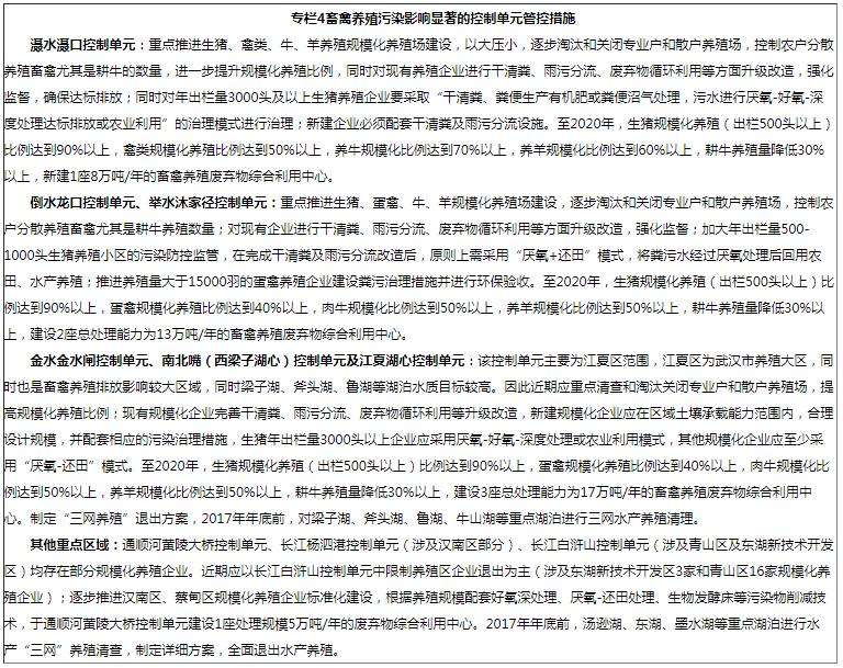 優(yōu)化畜禽及水產(chǎn)養(yǎng)殖布局。2017年前,依法關閉或搬遷禁養(yǎng)區(qū)內(nèi)的畜禽養(yǎng)殖場(小區(qū))和養(yǎng)殖專業(yè)戶,對四環(huán)線公路以外的未達標小型養(yǎng)殖小區(qū)按照規(guī)模標準實施改造升級,不再擴大限制發(fā)展區(qū)養(yǎng)殖規(guī)模,同時做好糞污資源化利用和處理。2018年底前,限制養(yǎng)殖區(qū)規(guī)模以下養(yǎng)殖場全部退出,規(guī)模以上畜禽養(yǎng)殖場(小區(qū))須實現(xiàn)糞污資源化利用,達到環(huán)保要求;未達到環(huán)保要求的,依法責令停止生產(chǎn)或者使用,并處以罰款。鼓勵適宜養(yǎng)殖區(qū)內(nèi)散養(yǎng)戶逐步退出,支持發(fā)展高標準、現(xiàn)代化的畜禽養(yǎng)殖場(小區(qū)),實現(xiàn)畜禽養(yǎng)殖退養(yǎng)平衡。逐步退出水產(chǎn)“三網(wǎng)”養(yǎng)殖。2017年1月底前,拆除梁子湖、湯遜湖、東湖、斧頭湖等重點湖泊的漁業(yè)“三網(wǎng)”設施;2017年12月底前,完成全市湖泊保護目錄中湖泊的漁業(yè)“三網(wǎng)”設施拆除。開展?jié)O業(yè)禁養(yǎng)區(qū)劃分,優(yōu)化水產(chǎn)養(yǎng)殖空間布局。中心城區(qū)40個湖泊列入漁業(yè)禁止養(yǎng)殖區(qū),不得開展經(jīng)營性水產(chǎn)養(yǎng)殖;其他126個湖泊由各轄區(qū)人民政府確定禁、限養(yǎng)殖分類,原則上列入漁業(yè)限制養(yǎng)殖區(qū),對列入限制養(yǎng)殖區(qū)的由各區(qū)人民政府依據(jù)湖泊水質狀況制定養(yǎng)殖水域、面積、種類、密度等養(yǎng)殖規(guī)范,實行不投肥、不投藥、不投飼的生態(tài)養(yǎng)殖模式。到2020年,禁養(yǎng)區(qū)內(nèi)全部畜禽養(yǎng)殖及水產(chǎn)養(yǎng)殖企業(yè)退出;限養(yǎng)區(qū)內(nèi)規(guī)模以下畜禽養(yǎng)殖企業(yè)退出,完成水產(chǎn)禁、限養(yǎng)殖區(qū)域劃分,退出全部湖庫禁養(yǎng)區(qū)內(nèi)水產(chǎn)養(yǎng)殖,其他區(qū)域內(nèi)實施水產(chǎn)生態(tài)養(yǎng)殖改造。