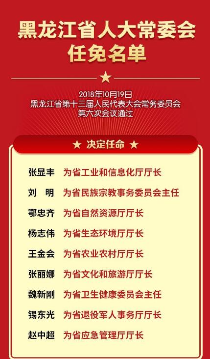 2018年10月19日,黑龍江省第十三屆人民代表大會常務(wù)委員會第六次會議通過黑龍江省人大常委會任免名單。