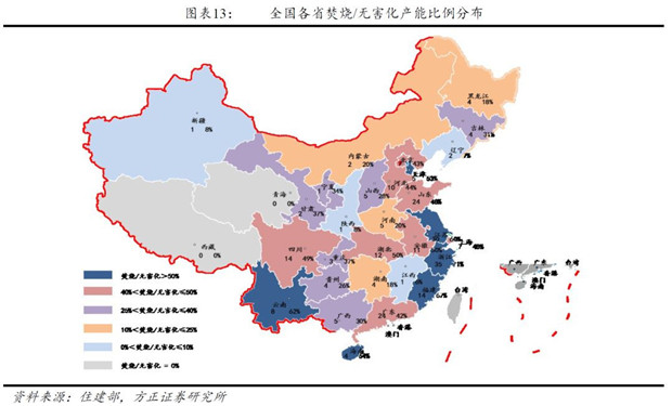 從焚燒處理占無害化產(chǎn)能比例來看,2016年全國(guó)焚燒處理占無害化處理比例為41%,全國(guó)有14個(gè)省焚燒處理占無害化處理比例超過該比例,且大多分布在中東部經(jīng)濟(jì)發(fā)展程度較高的地區(qū),其中浙江省焚燒處理占無害化處理比例最高,達(dá)到了71%。