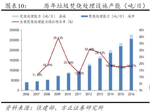從2005年開始,BOT模式在垃圾焚燒行業(yè)開始大規(guī)模推廣,根據(jù)住建部的統(tǒng)計(jì)年鑒,2016年全國(guó)生活垃圾焚燒處理設(shè)施數(shù)量達(dá)到299個(gè),同比增長(zhǎng)16.34%;生活垃圾焚燒處理能力達(dá)到27.82萬噸/日,同比增長(zhǎng)18.28%。2012-2016年年均復(fù)合增速20%左右。
