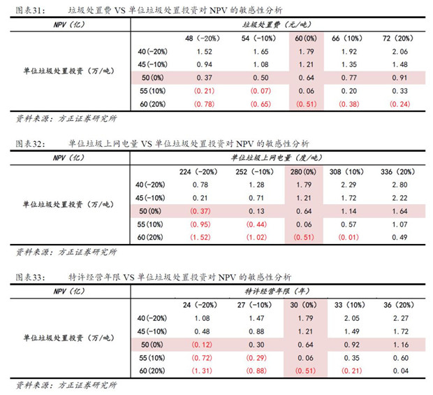 通過敏感性測(cè)試,項(xiàng)目NPV影響因素由大到小依次為:?jiǎn)挝煌顿Y額>單位垃圾上網(wǎng)電量>特許經(jīng)營(yíng)期限>垃圾處置費(fèi)。單位投資額對(duì)于項(xiàng)目NPV影響最大,建設(shè)期成本管控對(duì)于項(xiàng)目整體估值影響最大;其次為單位垃圾上網(wǎng)電量,受到垃圾熱值、焚燒設(shè)備效率、自用電比例等因素影響;其次為特許經(jīng)營(yíng)年限;最后為垃圾處置費(fèi)。