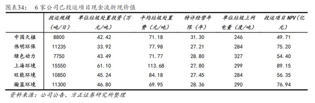 已投運(yùn)項(xiàng)目中,處置價(jià)格由高到低依次為上海環(huán)境、旺能環(huán)境、偉明環(huán)保、綠色動(dòng)力、中國(guó)天楹、瀚藍(lán)環(huán)境。